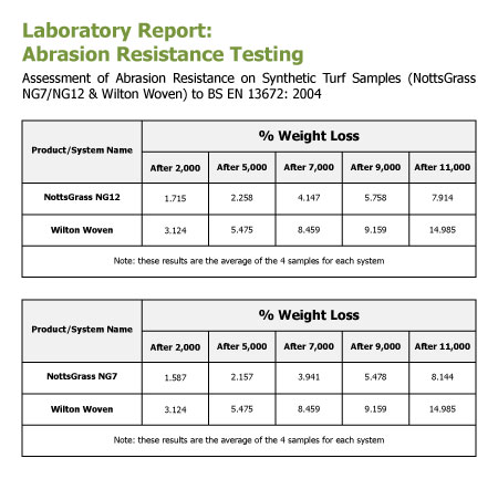 Interestingly, the results of more realistic ‘abrasion resistance’ testing on tufted and woven surfaces – based on the British Standard test (BS EN 13672) used by the ECB in its TS6 Performance Standard – are quite different.